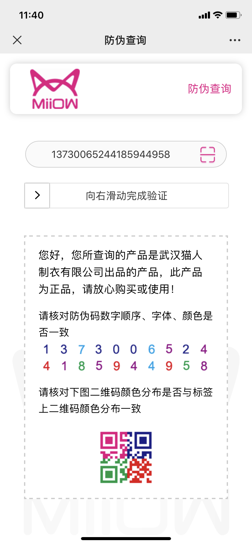 彩色二维码是很好的思路,与普通的黑白二维码不同,彩色二维码把二维码分成四个区域,每个区域一种颜色,颜色组合可变,再高级一点还有不同颜色组合的数字字符串码。初期彩色二维码的制作工艺难度较大,可有效防止造假者仿冒,但是,随着制造设备的普及,彩色二维码门槛越来越低,做为初步防伪验证的手段,效果也越来越差。此外,彩色二维码还有一个关键问题,就是需要用户扫码后再逐个比对颜色组合,标签上和网页上是否一致,这又极大提升了消费者参与复杂度。
