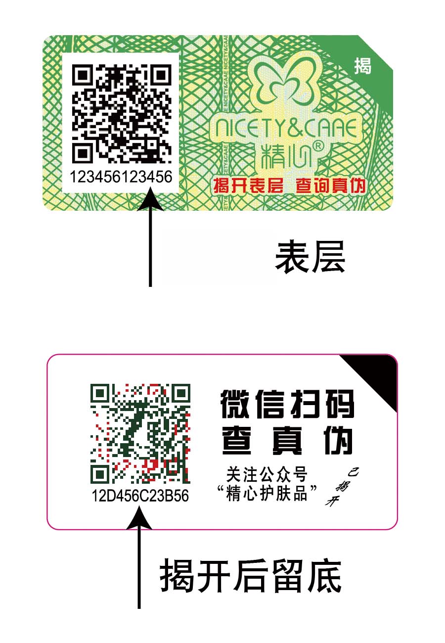 图2、双层防伪追溯标,表层追溯码,底层防伪码,两码相关联,从防伪码也可追查经销商信息